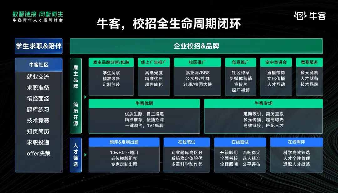 现在,牛客已经发展成围绕优质学生群体,提供求职、笔试题库和社区于一体的校招全生命周期平台,为企业提供以高科技人才为核心的校园招聘全场景服务,包括雇主品牌宣传、简历开源和人才筛选。“对尚未正式进入职场的学生用户来说,牛客是一个求职'备考'平台,他们会提前8-12个月来寻找未来可能的就业方向,在建立感知、确定目标、准备笔试、完成面试后,还会与其他用户讨论要选哪个offer。对企业而言,想要获取足够多的简历数,就必须在学生毕业之前抢占用户心智,树立良好的雇主形象,这让牛客的收入模式从单纯的简历环节向前延伸至企业品宣环节,让招聘成为一个‘长期主义’的事情。