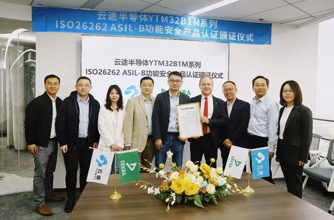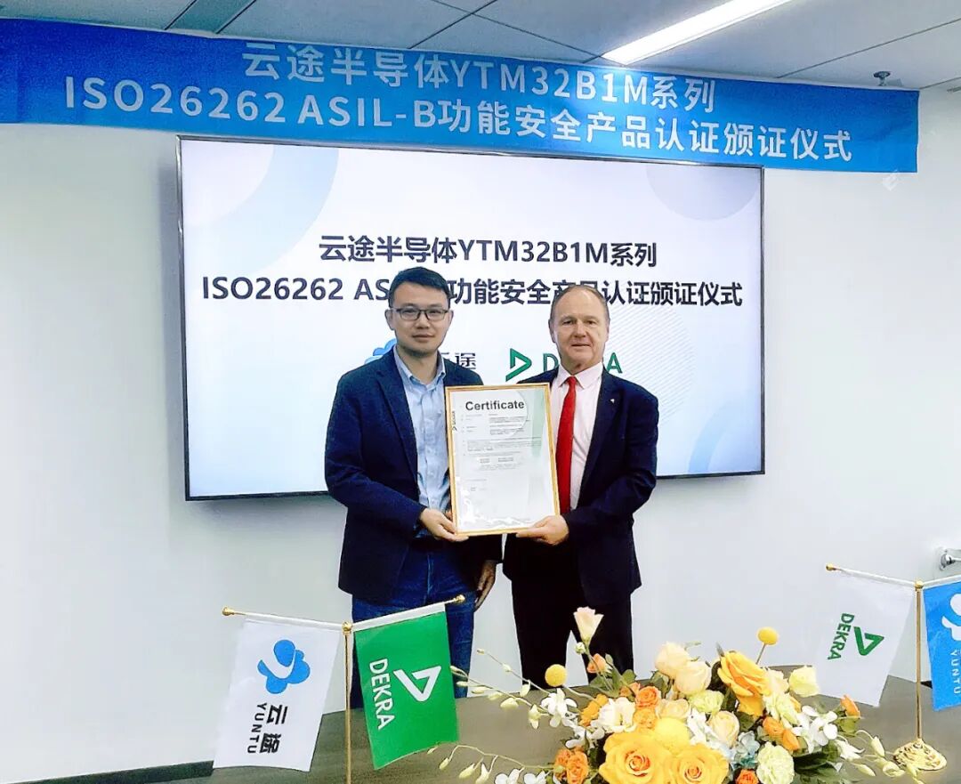 义柏资本长期融资服务企业苏州云途半导体有限公司(以下简称“云途半导体”)的YTM32B1M系列产品4月正式获得了由DEKRA德凯颁发的ISO 26262 ASIL-B产品认证证书,这是国内首个获得功能安全产品认证的车规级MCU产品。云途半导体和DEKRA德凯于2023年4月23日在云途半导体苏州总部举行颁证仪式,双方代表共同见证了这一重要时刻。