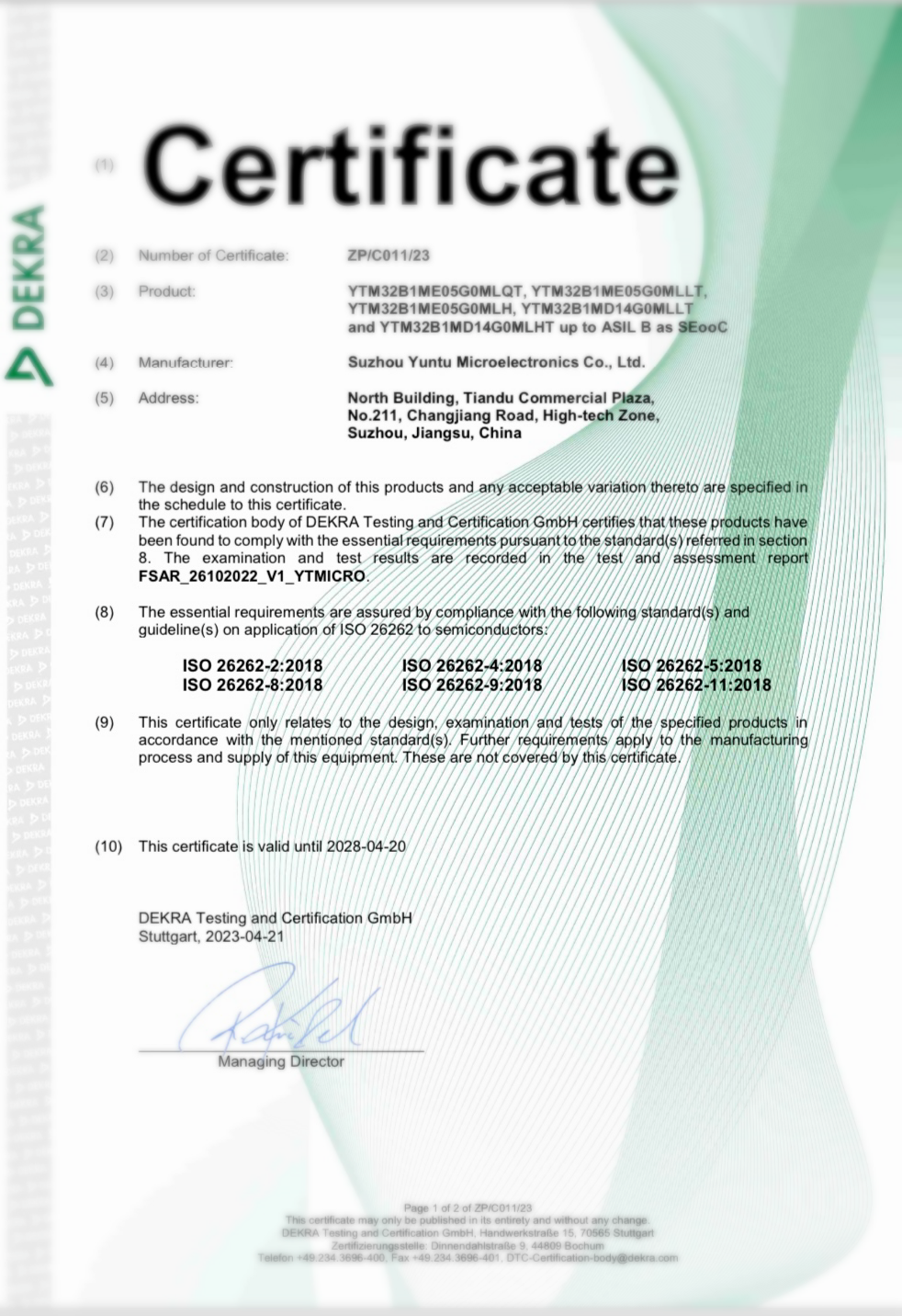 汽车行业是安全先行的行业。智能化、网联化的快速发展使汽车的电子电气系统日益复杂,其对安全性的要求则尤为凸显。云途半导体凭借着高水平技术团队和丰富的功能安全开发经验,顺利通过了此次认证并获得了DEKRA德凯颁发的ISO 26262:2018汽车功能安全ASIL B产品认证证书。我们很荣幸能够见证中国车规级MCU在产品的功能安全认证上取得的阶段性进展。期待未来双方能够进一步合作,并共同探索与研究。