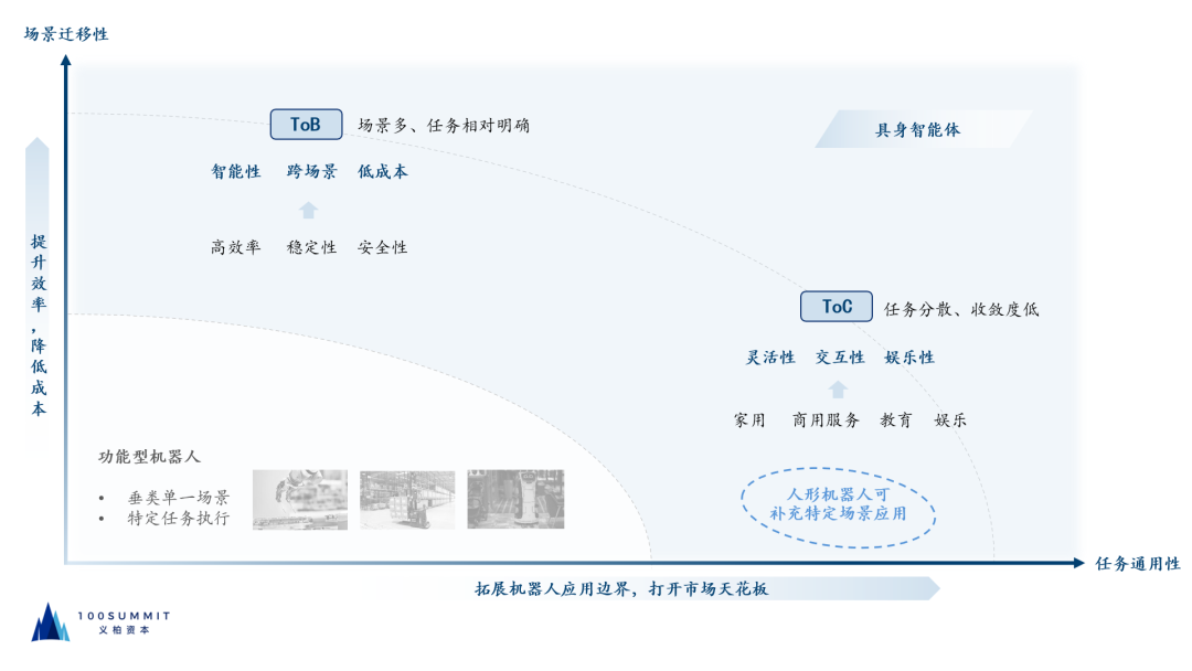 第一代智能机器人以执行程序为导向的功能性机器人为主,集成专用控制器,结合垂类算法开发,对行业最大的改变在于提升了整体自动化能力;具身时代的机器人将更具智能性,具备实体世界感知及理解、预测规划、行动决策的能力,可在更多场景应用,真正替代人力; -