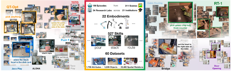 RT-X:Google DeepMind与33家学术研究机构汇集了22种不同机器人类型的数据,涵盖100万个片段,展示了机器人500多项技能和16万项任务表现,创建Open X-Embodiment数据集,这是目前最全的机器人数据集。RT-1及RT-2可基于此数据集进行训练,提升准确率,实现新技能的解锁。