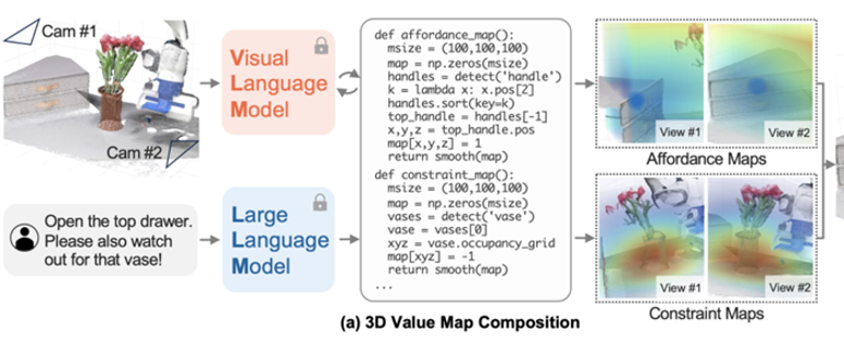 先用代码在物理世界构建 - 调用算法 – 完成非基于学习的传统算法;实现方式为给定环境的RGB-D 观测和语言指令, LLM 生成代码与 VLM 交互,产生一系列在机器人的观测空间中建立的 3D 机会图和约束图(统称为值图),然后将组合的值图作为运动规划器的目标函数,用于合成机器人操纵的轨迹。这个路径能实现最简单的基础动作的运动规划和执行,但多数情况只能在初始轨迹中实现零样本训练。